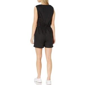 Amazon Essentials Women Size 4 Linen Blend Romper Black V Neck Drawstring NEW. - Black Wash Effect - 55% Linen, 45% Cotton