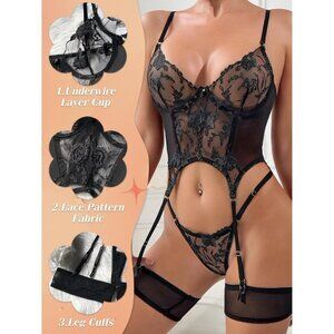 🆕Women Black Sexy Corset Teddy Lingerie 3 Piece with Garter Belt Lingerie Sets