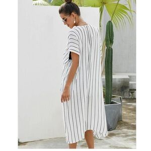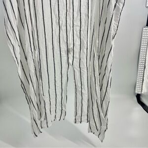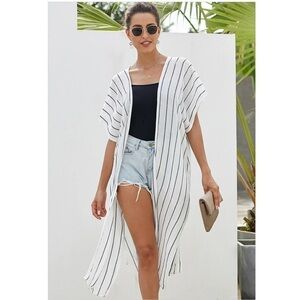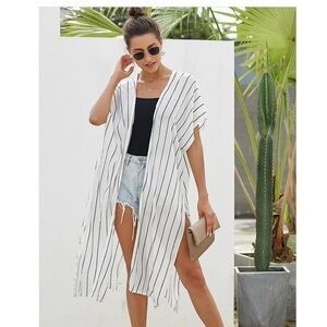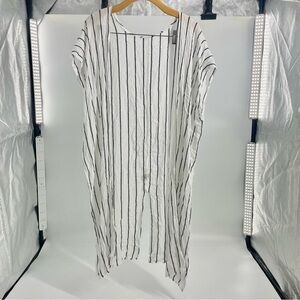 Women Black Striped White Boho Minimalist Open Front Cardigan Kimono Outerwear. One Size. Super relaxed and oversized. Side slits and cap sleeve. Can we worn as a swim coverup as well. In excellent pre-owned condition.