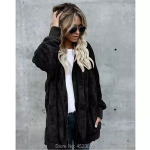 Women Black hooded Teddy oversized plush jacket long sleeve faux fur coat