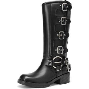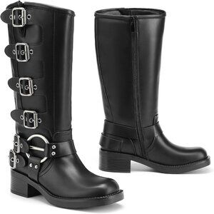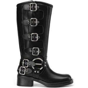 ⚡Women Black zipper Polyurethane Knee High Riding Side Zipper Chunky Heel Boots