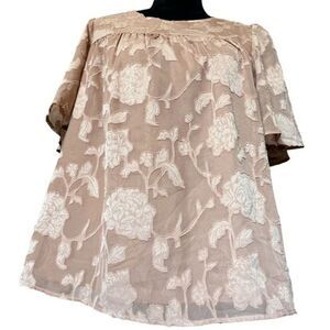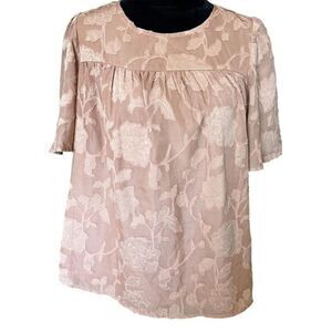 Women Blouse Deep Rose Floral Applique Flouncy Sleeve Button Back Neck Sz Small