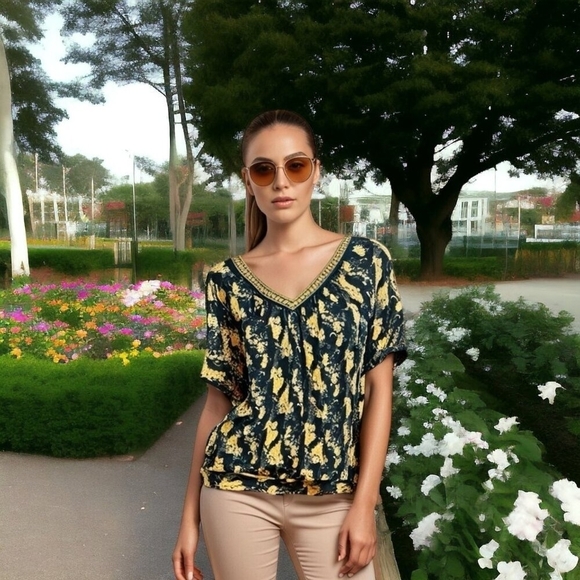 Discover the effortless charm of this FREE PEOPLE Women’s Blouse, featuring a stunning navy blue, black, and yellow #floral print. Crafted from 100% rayon, this weightless, #loosefit top is perfect for a relaxed yet chic look. Size S with full length 25” and a pit-to-pit measurement of 24”, it ensures comfort and style. Barely used and in excellent condition, this blouse offers a sheer, airy feel, making it ideal for any season. Pair it with your favorite jeans or skirts for a #boho vibe. The intricate floral design adds a touch of nature-inspired beauty, while the loose fit enhances comfort. Don’t miss out on this versatile piece that combines elegance with ease.