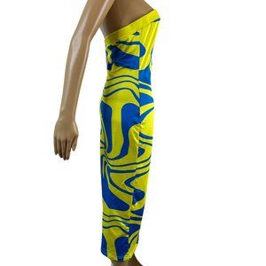 Women Bodycon Strapless Dress Large Yellow Blue Midi Stretch Backless
