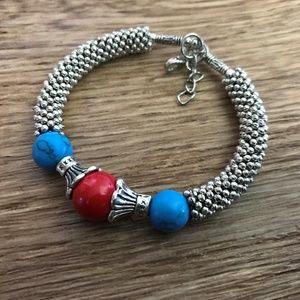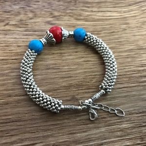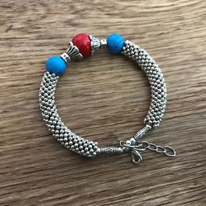 Women Bracelet Handmade Tibet style Blue and Red Silver Bracelet 7.5-8 inches