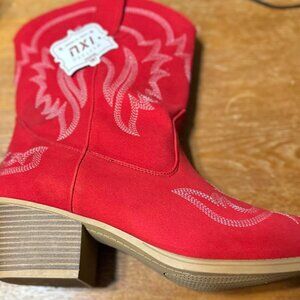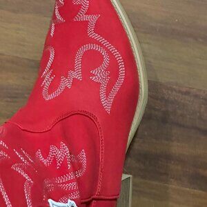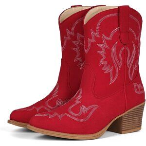 🆕Women Bright Red Faux Leather Ankle Cowgirl Pull On Pointed Toe Short Boots