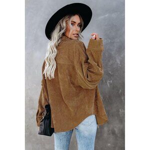 Women Brown Collared V Neck Button Down Oversized Long Sleeve Shirt Top