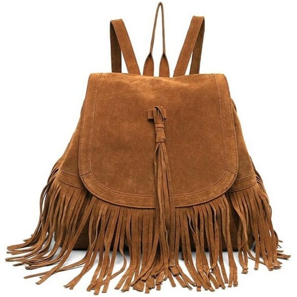 ✨Women Brown Leather Suede Fringed Tassel Backpack Purse Fashion Shoulder Bag