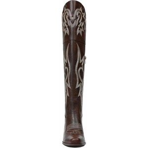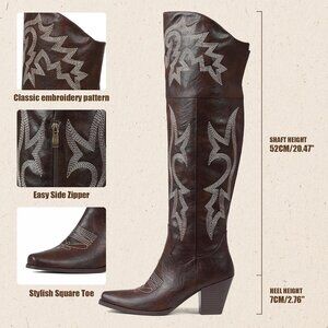 Women Brown Pu Polyurethane Thigh High Embroidered Pointed Toe Chunky Heels Boot