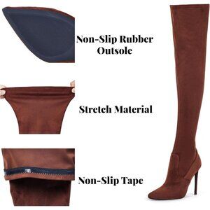 Comfortable Fit:Experience all-day comfort with our thigh high boots' flexible suede fabric that conforms to calves of all sizes. The addition of non-slip strips inside ensures a secure fit, allowing you to walk confidently without worrying about slipping or discomfort.