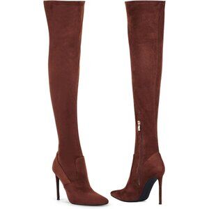 Women Brown Suede Pointed Toe 4.3 inch Stilettos Thigh High Stretch Heels Boots
