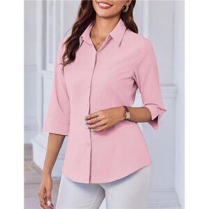 Feature: 3/4 sleeves are another major feature of button up blouse. Fold the sleeves up to turn it into a short-sleeved shirt, a piece of clothing with two uses, allowing you to experience different ways of wearing it. Classic V-neck elegantly highlights the collarbone; the slim waistline creates a sophisticated and capable workplace aura and highlights the self. The curved hem is a unique design that breaks the rigidity and monotony of women's shirts and highlights a touch of leisure.