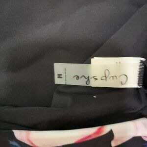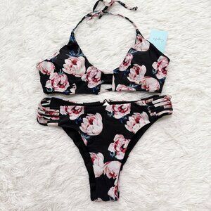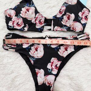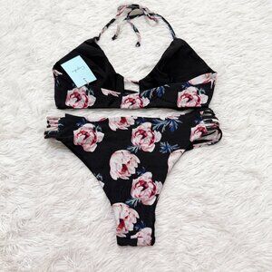 Women CUPSHE Floral Print Shoulder Straps Bikini Beach Set in Black Size Medium