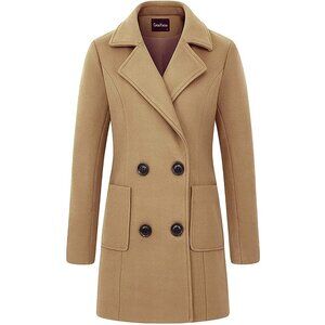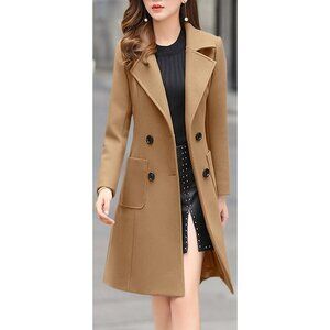 Women Camel Elegant Notched Collar Double Breasted Wool Blend Over Coat