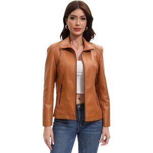 Women Camel Faux Leather Motorcycle Jacket Zip Up Trendy Going Out Coat