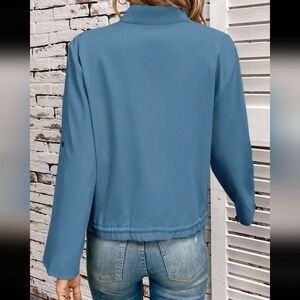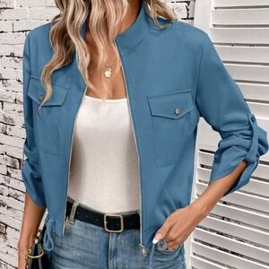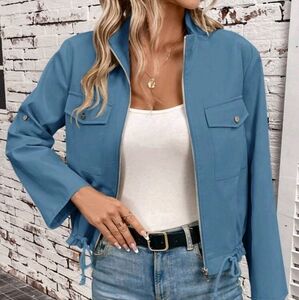 Women Casual Solid Color Roll Tab Sleeve Flap Pocket Drawstring Hem Lightweight