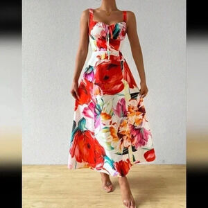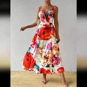 Women Chest Strap Sleeveless LongSummer Dress, Random Printed Cutout