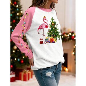 Women Christmas Flamingo Sweatshirt Cotton Blend Long Sleeve Casual Top