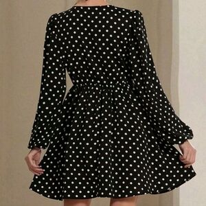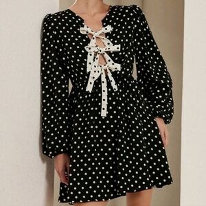 Women Classic Polka Dot Contrast Color Tie Front Long Sleeve Mini Dress