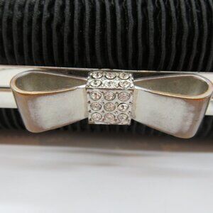 Women Atmosphere Black Fabric Ornate Clasp Clutch Chain Strap Purse Bag. Strong metal frame with its ruffle like fabric body feels great in your hand. Ornate rhinestone bow clasp opens into a roomy lined interior. Small inside pocket with Atmosphere logo label. Removable silver chain strap can be hidden inside or used over shoulder. Simple and elegant.