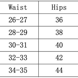 Small=Waist:26-27,Hips:36,Length:41.7; Medium=Waist:28-29,Hips:38,Length:41.7; Large=Waist:30-31,Hips:40,Length:42.1; X-Large=Waist:32-33,Hips:42,Length:42.1; XX-Large=Waist:34-35,Hips:44,Length:42.5.