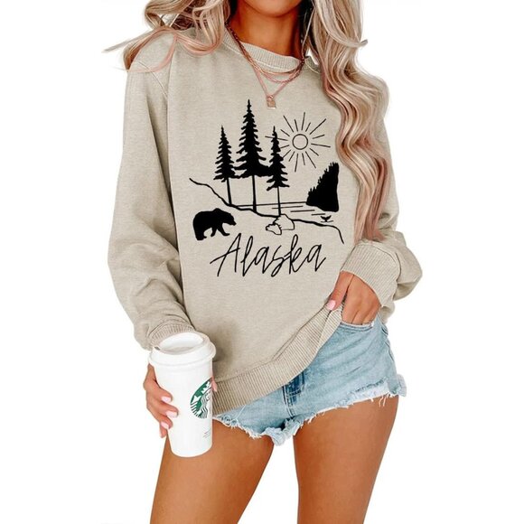 Embrace the rugged beauty of Alaska with this stylish and cozy sweatshirt. Featuring a striking graphic design that captures the essence of the Last Frontier, this top showcases towering pine trees, a majestic bear, and the radiant sun against a picturesque landscape. The soft cotton-blend fabric ensures all-day comfort, while the relaxed fit allows for effortless layering. Perfect for casual outings or lounging at home, this sweatshirt is a must-have for anyone who appreciates the great outdoors and the allure of the Alaskan wilderness. With its eye-catching design and snug warmth, it's an ideal choice for chilly days or evenings spent admiring nature's splendor.