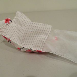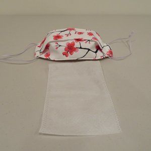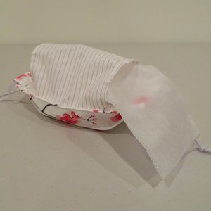 Women Handmade Reusable Washable Cotton Face Mask. Package of 10 disposable filters included. 2 layers of cotton material sewn together, breathable and comfortable. Expandable pocket design for easy insert of filter and adds the 3rd layer to the mask. Elastic ear loops can be adjusted for individual fit. Tie and knot at the desire placement, pull and hide the knot inside the band opening. No nose wire. No returns on face masks.