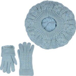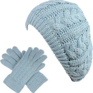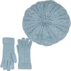 Features: This soft knit beret set includes a slouchy, relaxed cable knit hat and matching gloves. The plush fleece lining offers extra warmth and comfort, making it ideal for fall and winter. The hat features a cute button detail at the top and a ribbed trim for a snug fit. The stylish knits create a casual yet elegant look, perfect for adding a chic touch to your winter wardrobe. Available as a single hat or a matching set with gloves, making styling super easy and this set a lovely holiday gift option.