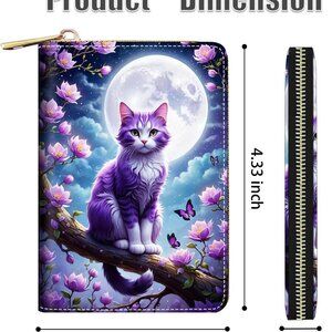 Features: Crafted from soft faux leather featuring a fun and whimsical cat under the moon pattern. This compact wallet offers 9 card slots, 2 pockets for bills, and a secure zip-around closure. It’s lightweight yet spacious enough to hold all your cards, IDs, cash, and receipts. The RFID blocking technology adds an extra layer of safety, protecting your info from digital pickpocketing.