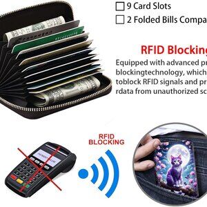 Women Credit Card Holder Leather Wallet RFID Blocking Zipper Accordion Cat Under