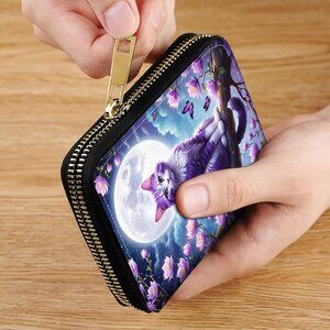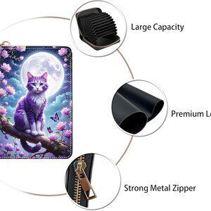 Women Credit Card Holder Leather Wallet RFID Blocking Zipper Accordion Cat Under The Moon — The perfect size for all your essentials with a cute feline twist.