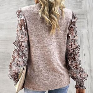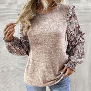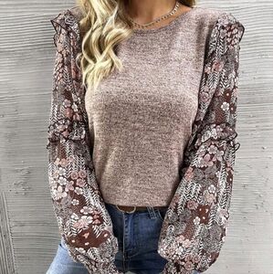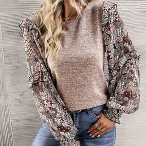 Women Crew Neck Long Sleeve Floral Print Patchwork Casual Blouse