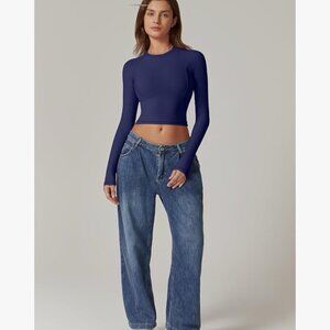 Women Crew Neck Long Sleeve Shirt Size XS Black Fitted Crop Seam Cup Going Out