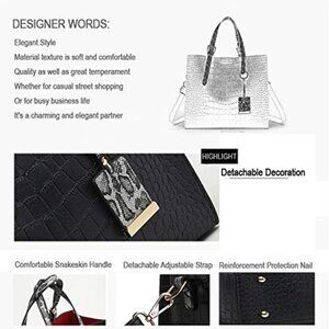 Features: Made of high-quality soft PU leather with a striking crocodile pattern and a snake skin handle for a chic vibe. Large capacity with 1 main compartment, 2 slot pockets, and a back wall zipper pocket, perfect for carrying A4 papers, phone, makeup, umbrella, and more. Versatile use as a tote, shoulder bag, or crossbody with an adjustable, detachable strap.