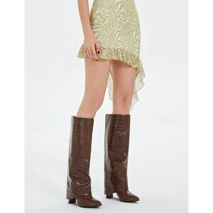 Women Crocodile-brown Leather Fold Over Knee High Chunky High Heels Long Boot