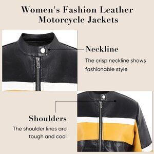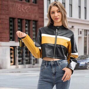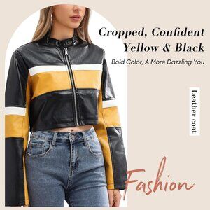 Women Cropped Faux Leather Jacket Moto Biker Bomber Jackets Zip Up Black Yellow