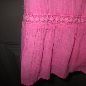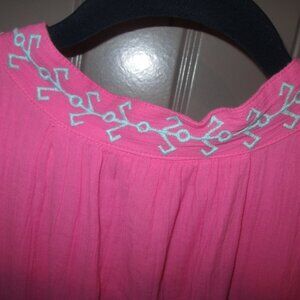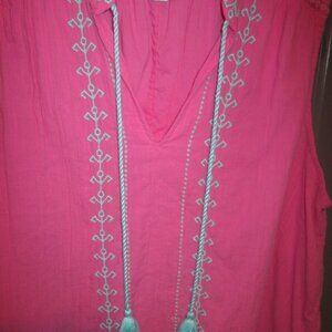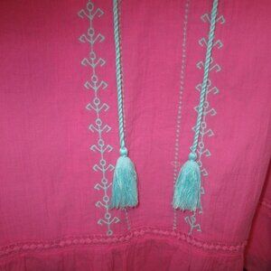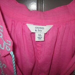 Women Crown & Ivy XL Pink /Blue Top, Flutter Sleeve, "V" Neck Opening w/Tassels. Bought from Belks Dept Store. Love the colors. Lots going on with blue embroidery, tassels and lace crochet inset along bottom flounce and shoulder area. Guazey mateiral, lined. 100% cotton shell and lining. Never worn.