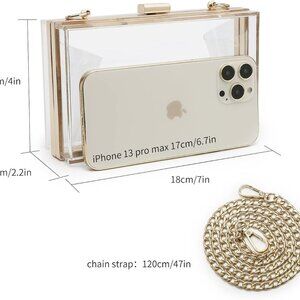 EASY CARRY : This clear clutch purse is very easy to carry as clucth handbag, evening bag, shoulder bag or crossbody bag, and comes with detachable gold chain strap with drop size: 23".