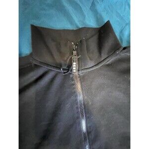 This Women's DKNY Sport 1/2 Zip Pullover Crop Logo Sweatshirt in blue and black, size small, is a stylish and comfortable activewear piece perfect for various occasions including walking, hiking, running, and jogging. Made from a polyester cotton blend fabric, this sweatshirt features a collared neckline, long sleeves, and a front pocket. The adjustable bungee cord at the waist adds a personalized touch to the relaxed fit. With a sporty yet trendy theme, this sweatshirt embodies a minimalist edge and a casual cool style that is both functional and fashionable for the winter, fall, and spring seasons.