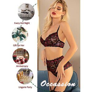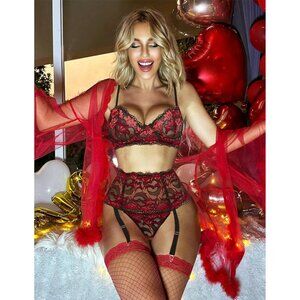 Women Dak Red Lingerie Set High Waisted Underwire Lingerie With Garter Belt Lace