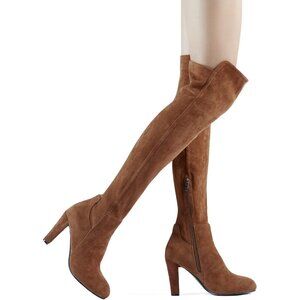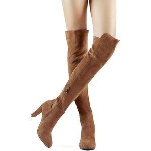 Women Dark Brown Faux Suede Chunky Heel Stretch Over The Knee Thigh High Boot