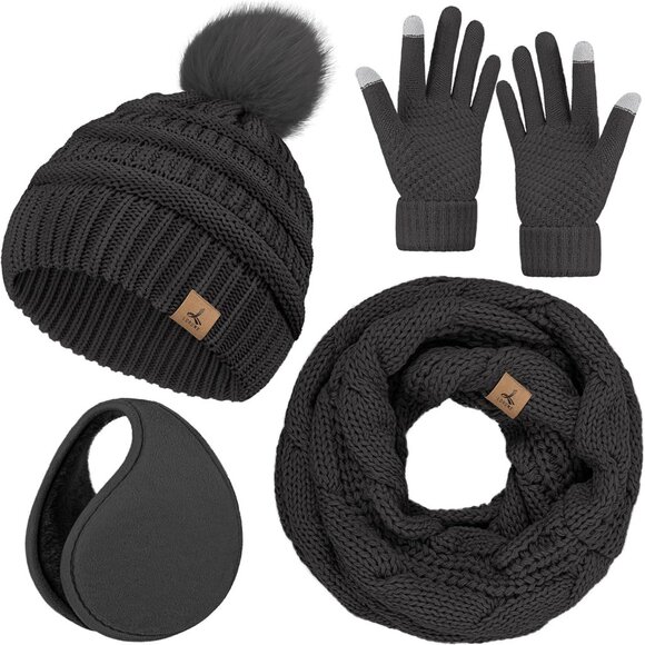 Women’ Dark Gray Knit Beanie Hat, Gloves, Scarf & Ear Warmer Set - Winter