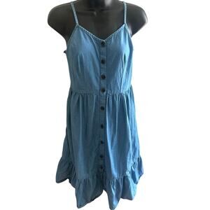 Women Denim Chambray Sundress Western Boho Coastal Button Front Tiered Ruffle S