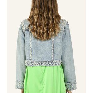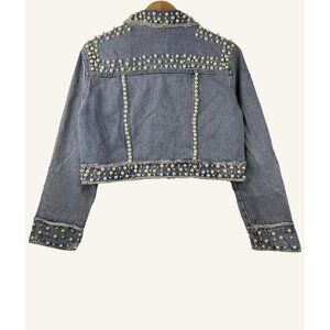 Women Denim Jacket Coat Pearls Colored Beaded Crystal Rhinestone Size M Blue