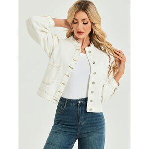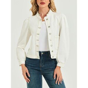 Women Denim Jacket Cotton Blend Puff Sleeve Ruffle Neck Casual Fall