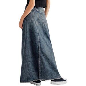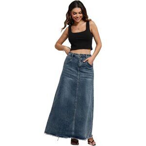 Women Denim Maxi Skirt Frayed Raw Hem High Waist Dark Blue