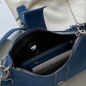 Features: Crafted from soft, durable denim with a stylish design. It features a magnetic buckle, zipper closure, and a built-in small pocket for your valuables. The adjustable denim shoulder strap and optional metal chain give versatile carrying options.