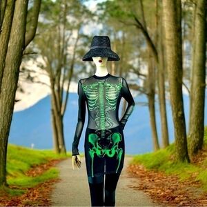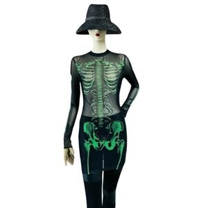 Step into the spotlight with this SHEIN Reflective Skeleton Print Bodycon Dress, a chic #HalloweenDress that's both stylish and fun. This #miniDress, made from 100% polyester, is perfect for your spooky celebrations. The #sheerdress design features a #SkeletonPrint in black and green, giving you a bold, edgy look.