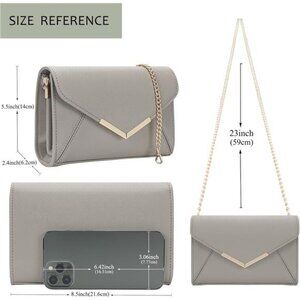 Formal Clutch Dimensions --- Width: 21.6cm, Height: 14cm, Depth: 6.2cm (8.5*5.5*2.4inch), Strap: 120cm total length. This classy clutch is large capacity to hold Iphone14 plus and all party necessities.