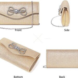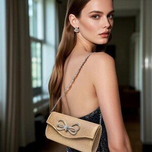 This exquisite Evening Clutch Bag exudes elegance with its high-quality glitter PU leather and luxurious shiny rhinestone bow embellishment. Its impeccable design features remarkable craftsmanship, ensuring long-lasting durability.